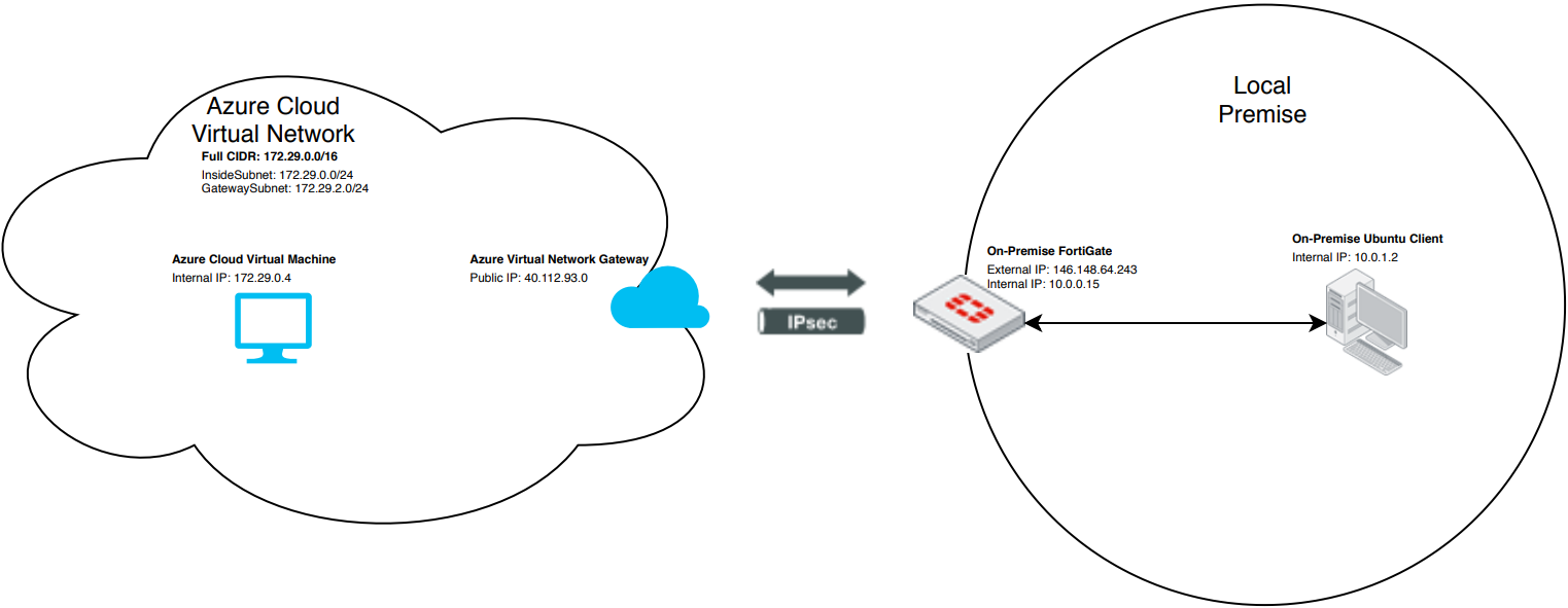 Instances that you launch into an Azure VNet can communicate with your own remote network via site-to-site VPN between your on-premise FortiGate and Azure VNet VPN. You can enable access to your remote network from your VNet by configuring a virtual private gateway (VPG) and customer gateway to the VNet, then configuring the site-to-site VPC VPN.