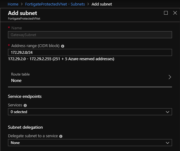 - In the Azure management console, go to your VNet, then Subnets > + Gateway subnet. You do not need to configure any fields on the Add subnet screen. You cannot change the name, as it must be GatewaySubnet for the VNet gateway to function. Azure should automatically populate the Address range (CIDR block) field with a subnet within your VNet. In this example, the VNet is 172.29.0.0/16, while the subnet is 172.29.2.0/24. You do not need to configure a route table or security group unless your environment needs special handling.