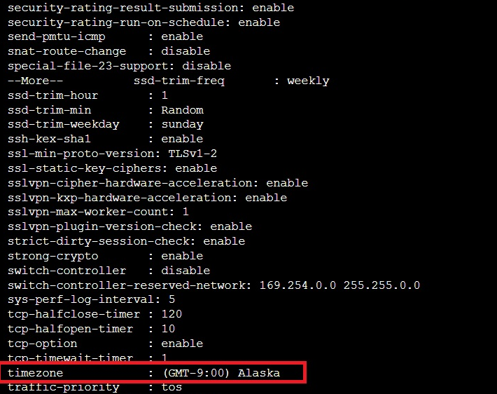 2. Check the timezone by running config system global and get commands.