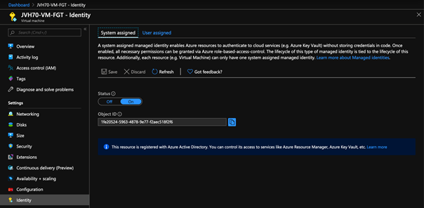The most common method is to use the Azure portal. In the FortiGate-VM resource in the Azure portal, go to Identity. On the System assigned tab, toggle the Status to On.