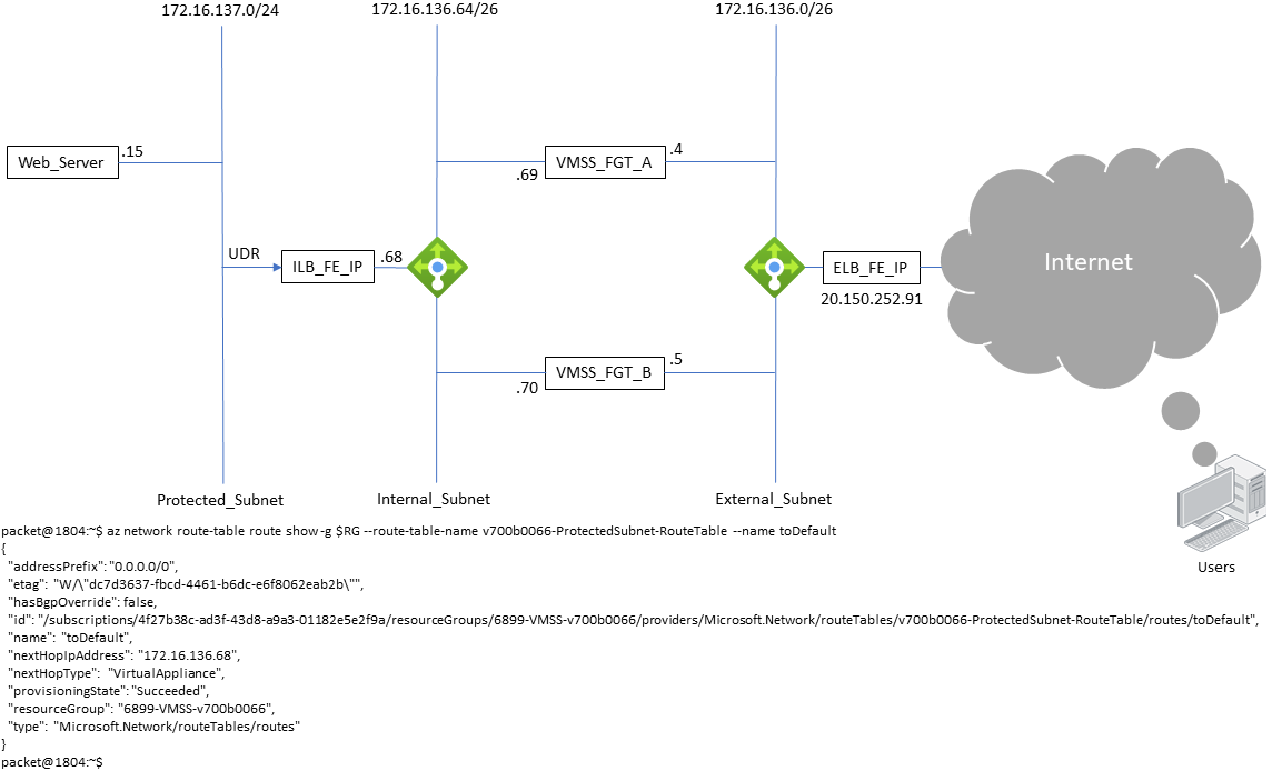 v700b0066-FGT-A # diagnose ip address list IP=172.16.136.4->172.16.136.4/255.255.255.192 index=3 devname=port1 IP=172.16.136.69->172.16.136.69/255.255.255.192 index=4 devname=port2 IP=127.0.0.1->127.0.0.1/255.0.0.0 index=7 devname=root IP=10.255.1.1->10.255.1.1/255.255.255.0 index=11 devname=fortilink IP=127.0.0.1->127.0.0.1/255.0.0.0 index=12 devname=vsys_ha IP=127.0.0.1->127.0.0.1/255.0.0.0 index=14 devname=vsys_fgfm v700b0066-FGT-A # v700b0066-FGT-A # show system vdom-exception config system vdom-exception edit 10 set object system.cluster-sync next end v700b0066-FGT-A # v700b0066-FGT-A # show system auto-scale config system auto-scale set status enable set role primary set sync-interface "port2" set psksecret ENC TJSGPV1J2oxb7+ePiw8Sd42y6fHGYfHm84LeKa2wGTkcMxDfLg94dpuNqB8ID53wke91tNs3lyl0rZ5xc8cU6NGGLTwS7U3pFkkd0vxCMF37fDVLcItPLDXN2EWXTiX5v2s02QpUTkqIWlAv/KedMpRMuKdx6DDWmhWUoLnw99CO3zUWQjtf5FAtxIupcL6yGtSAVw== end v700b0066-FGT-A # v700b0066-FGT-A # show system cluster-sync config system standalone-cluster edit 1 set peerip 172.16.136.70 next end v700b0066-FGT-A # v700b0066-FGT-A # show system ha config system ha set session-pickup enable set session-pickup-connectionless enable set session-pickup-expectation enable set session-pickup-nat enable set override disable end v700b0066-FGT-A # v700b0066-FGT-A # show firewall vip 172.16.137.15:22 config firewall vip edit "172.16.137.15:22" set uuid a26b50cc-db75-51eb-7dd5-a313054c614a set extip 20.150.252.91 set mappedip "172.16.137.15" set extintf "port1" set portforward enable set extport 65022 set mappedport 22 next end v700b0066-FGT-A # v700b0066-FGT-A # show firewall vip 172.16.137.15:80 config firewall vip edit "172.16.137.15:80" set uuid aba58d6a-db75-51eb-118b-b771bfbf59b4 set extip 20.150.252.91 set mappedip "172.16.137.15" set extintf "port1" set portforward enable set extport 80 set mappedport 80 next end v700b0066-FGT-A # v700b0066-FGT-A # show firewall vip 172.16.137.15:443 config firewall vip edit "172.16.137.15:443" set uuid b0e949d8-db75-51eb-fb60-f5537489a0bc set extip 20.150.252.91 set mappedip "172.16.137.15" set extintf "port1" set portforward enable set extport 443 set mappedport 443 next end v700b0066-FGT-A # v700b0066-FGT-A # show firewall policy config firewall policy edit 2 set name "to_VIP" set uuid c9ff1fd8-db75-51eb-6b34-e17d224884b9 set srcintf "port1" set dstintf "port2" set action accept set srcaddr "all" set dstaddr "172.16.137.15:22" "172.16.137.15:443" "172.16.137.15:80" set schedule "always" set service "ALL" set utm-status enable set ssl-ssh-profile "deep-inspection" set av-profile "default" set logtraffic all next edit 3 set name "to_Internet" set uuid d834ffb4-db75-51eb-e370-b6668f0fd24d set srcintf "port2" set dstintf "port1" set action accept set srcaddr "all" set dstaddr "all" set schedule "always" set service "ALL" set inspection-mode proxy set nat enable next end v700b0066-FGT-A # v700b0066-FGT-A # show router static config router static edit 1 set gateway 172.16.136.1 set device "port1" next edit 2 set dst 172.16.136.0 255.255.252.0 set gateway 172.16.136.65 set device "port2" next edit 3 set dst 168.63.129.16 255.255.255.255 set gateway 172.16.136.65 set device "port2" next edit 4 set dst 168.63.129.16 255.255.255.255 set gateway 172.16.136.1 set device "port1" next edit 137 set dst 172.16.137.0 255.255.255.0 set gateway 172.16.136.65 set device "port2" next end v700b0066-FGT-A # v700b0066-FGT-A # get system auto-scale status : enable role : primary sync-interface : port2 primary-ip : 0.0.0.0 callback-url : hb-interval : 10 psksecret : * v700b0066-FGT-A # v700b0066-FGT-A # diagnose sys ha autoscale-peers Serial#: FGTAZRUPN-GQBR9B VMID: 9b09d366-f5e2-490f-acab-3bbf2835bd7b Role: secondary IP: 172.16.136.70 v700b0066-FGT-A # v700b0066-FGT-A # diagnose sys ha checksum autoscale-cluster ================== FGTAZRJ_NNBQZJD0 ================== is_autoscale_primary()=1 debugzone global: b7 0b d4 ae bd 33 00 2d 81 e5 b4 77 79 06 41 8d root: 21 41 b7 00 7c 7e 66 86 26 99 be 0b 92 88 ed 1e all: 92 7d d2 09 b2 56 a2 86 9a 23 f5 72 d0 90 c3 1e checksum global: b7 0b d4 ae bd 33 00 2d 81 e5 b4 77 79 06 41 8d root: 21 41 b7 00 7c 7e 66 86 26 99 be 0b 92 88 ed 1e all: 92 7d d2 09 b2 56 a2 86 9a 23 f5 72 d0 90 c3 1e ================== FGTAZRUPN-GQBR9B ================== is_autoscale_primary()=0 debugzone global: b7 0b d4 ae bd 33 00 2d 81 e5 b4 77 79 06 41 8d root: 21 41 b7 00 7c 7e 66 86 26 99 be 0b 92 88 ed 1e all: 92 7d d2 09 b2 56 a2 86 9a 23 f5 72 d0 90 c3 1e checksum global: b7 0b d4 ae bd 33 00 2d 81 e5 b4 77 79 06 41 8d root: 21 41 b7 00 7c 7e 66 86 26 99 be 0b 92 88 ed 1e all: 92 7d d2 09 b2 56 a2 86 9a 23 f5 72 d0 90 c3 1e v700b0066-FGT-A # v700b0066-FGT-A # diagnose sys session sync sync_ctx: sync_started=1, sync_tcp=1, sync_others=1, sync_expectation=1, sync_nat=1, stdalone_sesync=1. sync: create=115:0, update=505, delete=1:0, query=5 recv: create=7:0, update=22, delete=0:0, query=0 ses pkts: send=0, alloc_fail=0, recv=0, recv_err=0 sz_err=0 udp pkts: send=626, recv=28 nCfg_sess_sync_num=1, mtu=1500, ipsec_tun_sync=1 sync_filter: 1: vd=-1, szone=0, dzone=0, saddr=0.0.0.0:0.0.0.0, daddr=0.0.0.0:0.0.0.0, sport=0-65535, dport=0:65535 - Confirm the configuration in the FortiGate B CLI. The following shows an example of possible output: