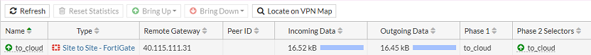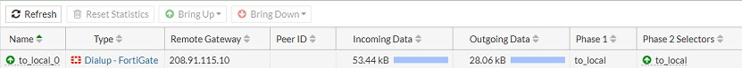 - In FortiOS on the local FortiGate, go to Monitor > IPsec Monitor. It should look like the following:
