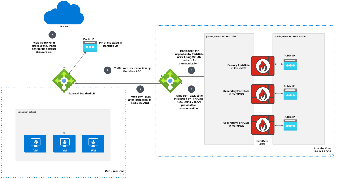 The FortiGate instances in the VMSS actively communicate with each other and the Azure fabric, ensuring consistent network traffic inspection. This design is particularly effective for environments that require a high level of security, such as enterprise applications or services that handle sensitive data.