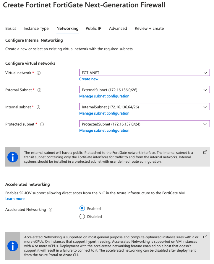 2. Enable Accelerated Networking if desired. You can enable this option to have a direct path from the VM to the Azure infrastructure NIC and allows for better performance. This is only available for specific instance types. See Enabling accelerated networking on the FortiGate-VM.