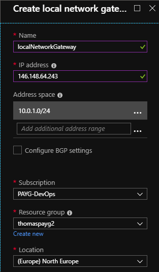 - If desired, enable Configure BGP settings. You define the BGP peer IP address for the local network gateway, but there are restrictions. See About BGP with Azure VPN Gateway.
