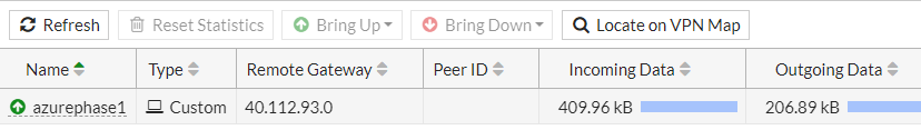 - In FortiOS, go to Monitor > IPsec Monitor to see if the tunnel is up. If it is not up, manually bring up the tunnel.