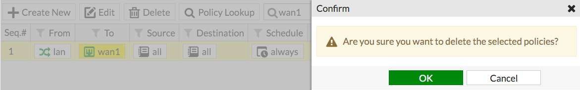 Many FortiGate models include a default Internet access policy that uses WAN1. This policy must also be deleted.