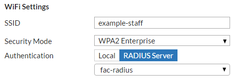 Under WiFi Settings, set Security Mode to WPA2 Enterprise, set Authentication to RADIUS Server, and add the RADIUS server configured on the FortiGate earlier from the dropdown menu.