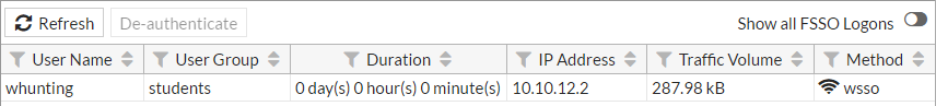Then on the FortiGate go to Monitor > Firewall User Monitor. From here you can verify the user, the user group, and that the WSSO authentication method was used.