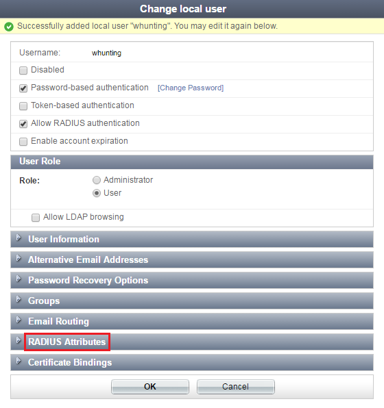 Note that, after you create a user, RADIUS Attributes appears as an option.