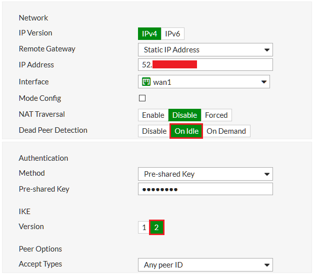 Disable NAT Traversal and set Dead Peer Detection to On Idle.