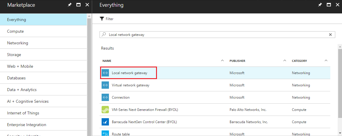 In the Everything blade search box, type Local network gateway, and select Create local network gateway.