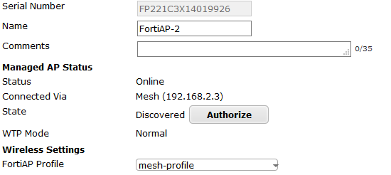 Doing this will allow FortiAP-1 to go online as soon as it is connected to the FortiGate. Optionally, you could connect the FortiAP to the FortiGate and then manually authorize it at that point, as will be done with FortiAP-2.