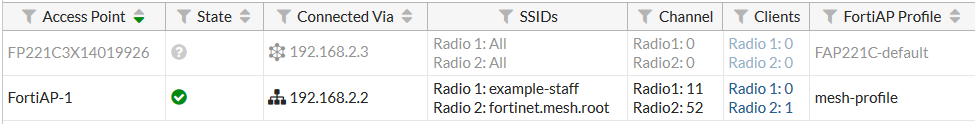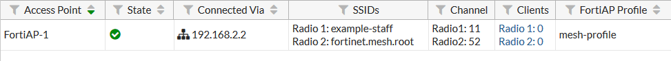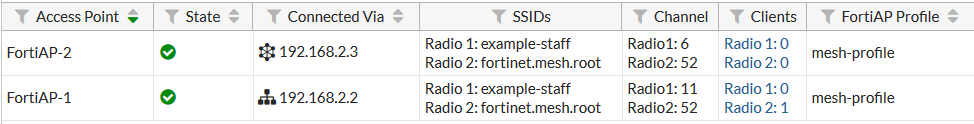 Power up FortiAP-2. Periodically click Refresh. With a minute or two, Radio 2 of FortiAP-1 will indicate 1 client and FortiAP-2 will be listed as mesh-connected.