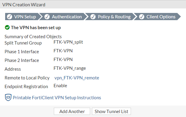 You can also go to Monitor > IPsec Monitor to view the tunnel's status, and Monitor > FortiClient Monitor to view the user and device.