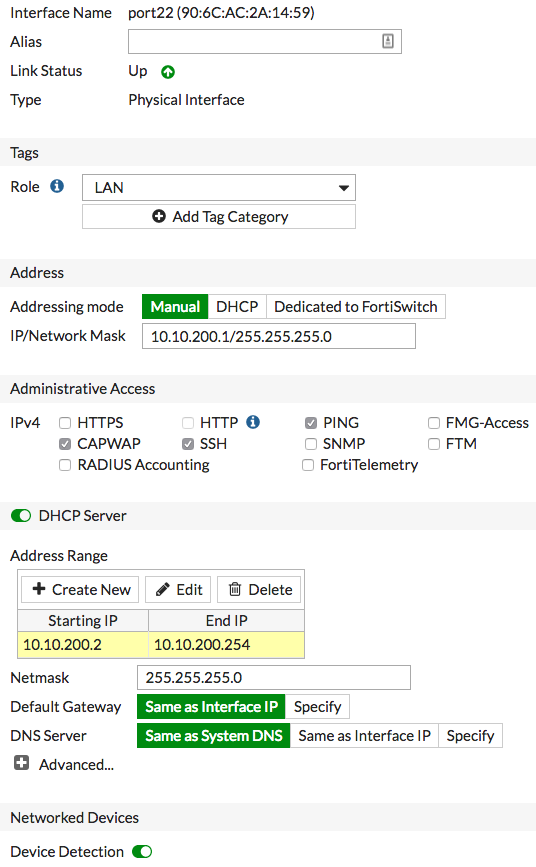 To edit the interface that will connect to the FortiAP (in the example, port 22), go to Network > Interfaces.