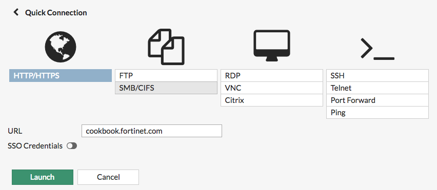 - To connect to the Internet, select Quick Connection. Select HTTP/HTTPS, then enter the URL and select Launch.