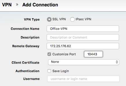 - Set VPN Type to SSL VPN, set Remote Gateway to the IP of the listening FortiGate interface (in the example, 172.25.176.62). Select Customize Port and set it to 10443.