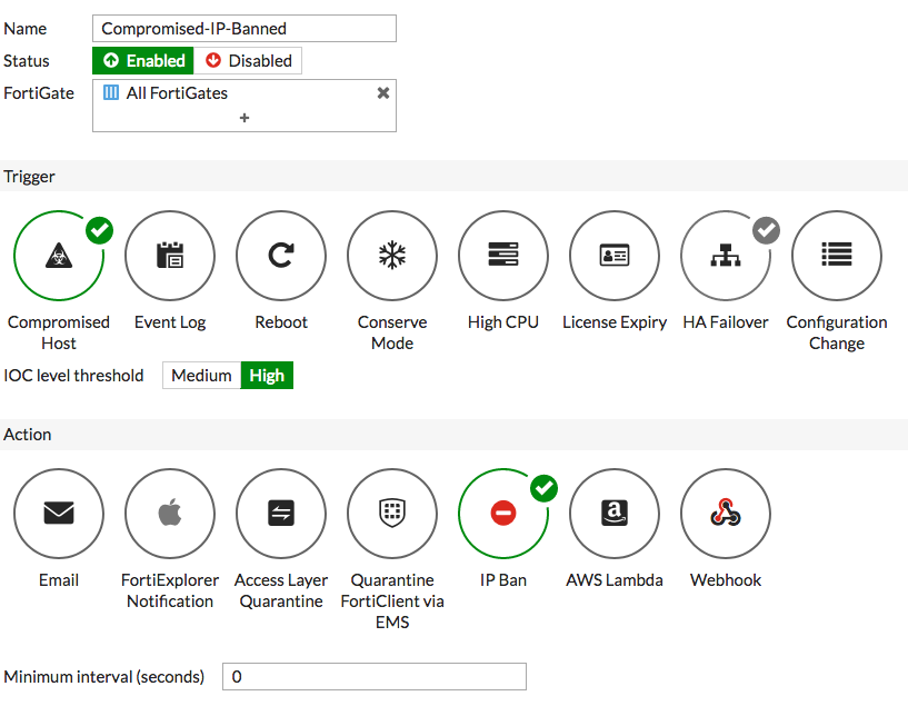 To create a new Automation that bans the IP address of a compromised host, go to Security Fabric > Automation and select Create New.