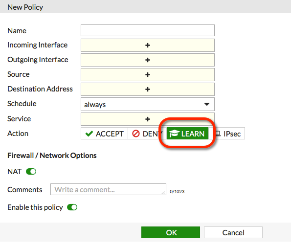 Once the feature is enabled on the VDOM, Learn is an available Action option when editing a policy.