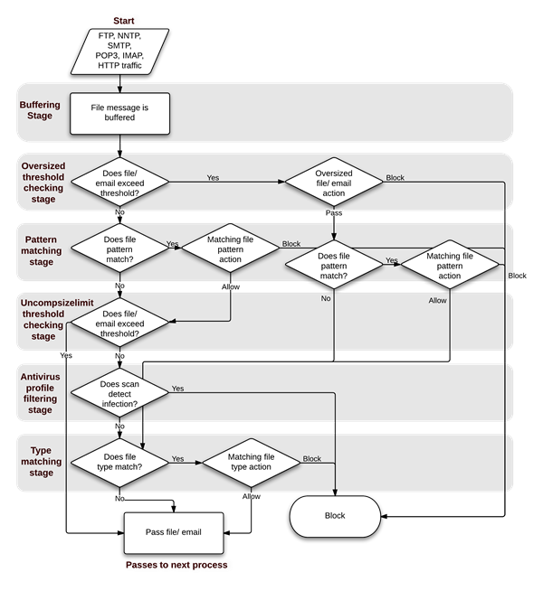 The following figure illustrates the antivirus scanning order when using proxy-based scanning. The first check for oversized files/email is to determine whether the file exceeds the configured size threshold. The uncompsizelimit check is to determine if the file can be buffered for file type and antivirus scanning. If the file is too large for the buffer, it is allowed to pass without being scanned. For more information, see the config antivirus service command. The antivirus scan includes scanning for viruses, as well as for grayware and heuristics, if enabled.