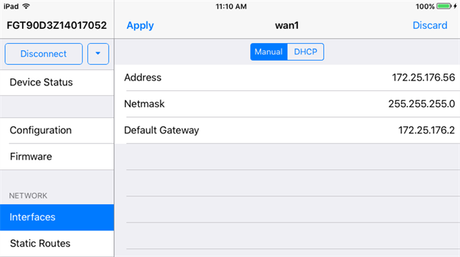 Go to Network > Interfaces and configure the WAN interface(s).In the example, the wan1 interface Address mode is set to DHCP by default. Set it to Manual and enter its Address, Netmask, and Default Gateway, and then Apply your changes.