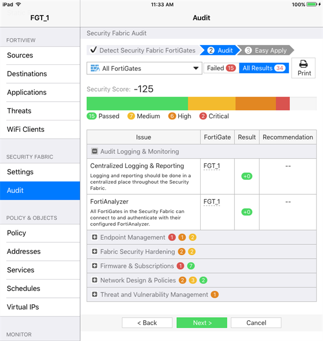Go to Security Fabric > Security Rating and follow the steps to determine a Security Score for the selected device(s). The results should identify issues ranging from Medium to Critical importance, and may provide recommended actions where possible.