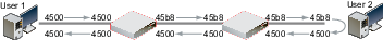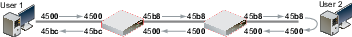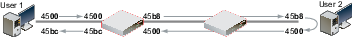 The following diagram shows the IP headers for the requests and replies by packet sniffers on the network interfaces on FortiGate A and FortiGate B, when an ICMP ping is sent between User 1 and User 2. The last two digits of each IP header are the ToS field, which contains the DSCP value.