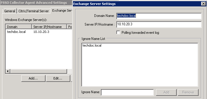 - On the FSSO collector agent, go to Advanced Settings > Exchange Server.