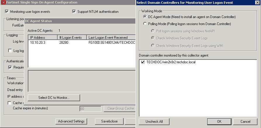 FSSO for Windows AD requires at least one Collector agent. Domain Controller agents may also be required depending on the Collector agent working mode. There are two working modes to monitor user logon activity: DC Agent mode or Polling mode.