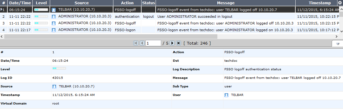 - Check the FortiGate event log, for FSSO-auth action or other FSSO related events with FSSO information in the message field.