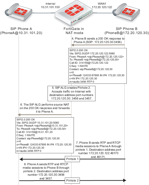 Phone B sends the 200 OK response to the INVITE message to the WAN1 interface. The SDP profile includes the port number that Phone B wants to use for its media stream. The FortiGate forwards 200 OK response to Phone A after translating the addresses in the SIP and SDP lines back to the IP address of Phone A. The SIP ALG also opens a pinhole on the Internal interface that accepts media stream sessions from Phone A with destination address set to the IP address of Phone B and using the port that Phone B added to the SDP m= line.