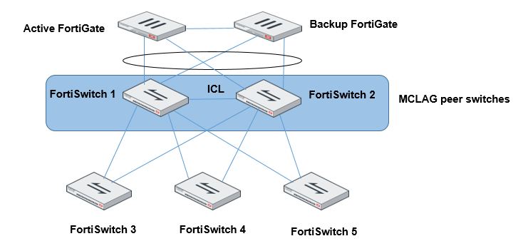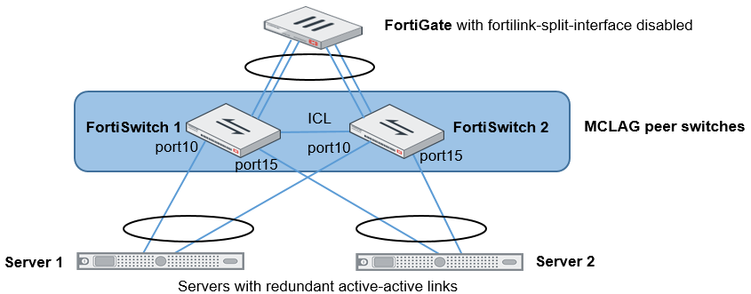 - Dual-homed servers connected to a pair of FortiSwitch units using an MCLAG