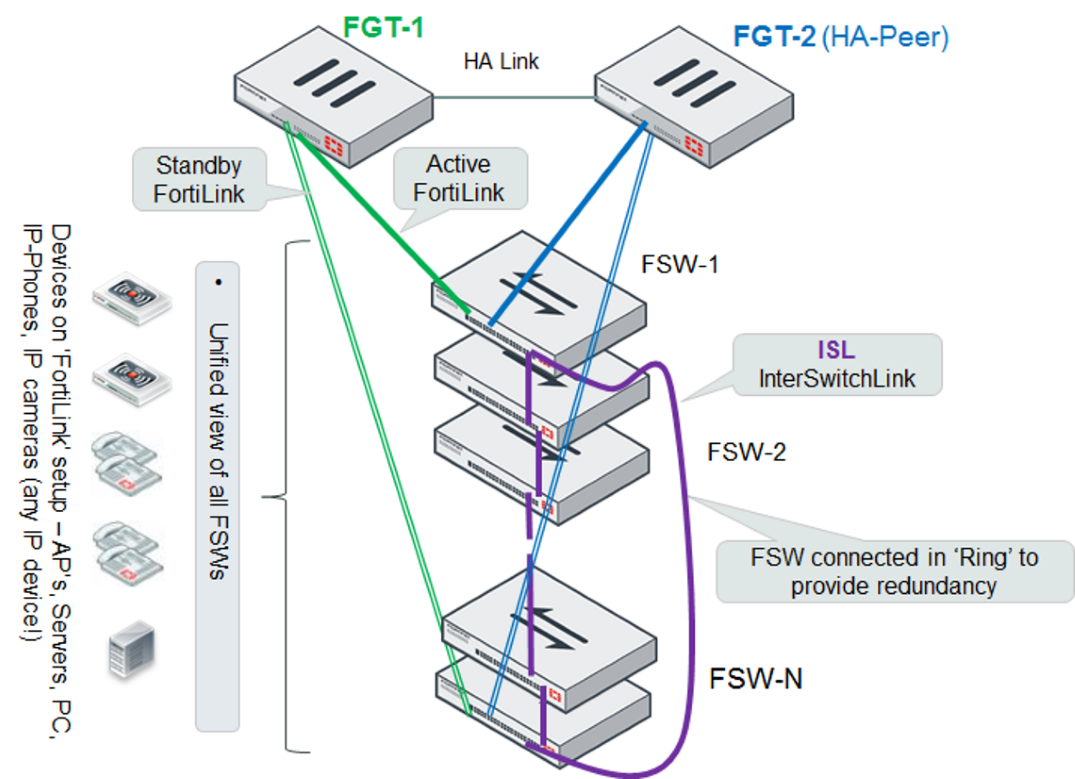 - Single FortiGate unit managing a stack of several FortiSwitch units