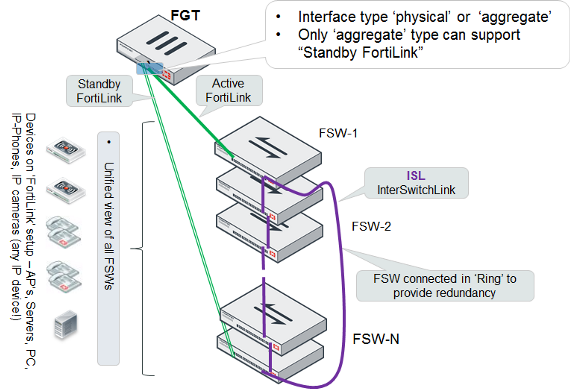 The FortiGate unit connects directly to one FortiSwitch unit using a physical or aggregate interface. The remaining FortiSwitch units connect in a ring using inter-switch links (that is, ISL).