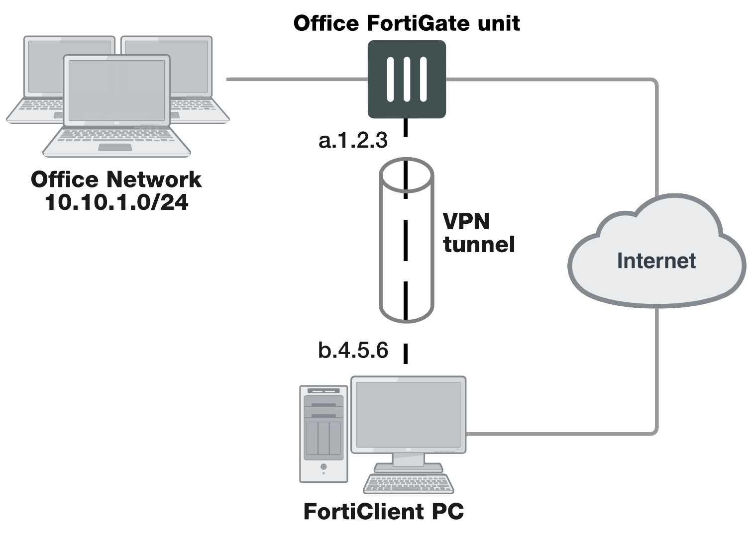 You can also create a VPN tunnel between an individual PC running FortiClient and a FortiGate unit, as shown below. This is commonly referred to as Client‑to-Gateway IPsec VPN.