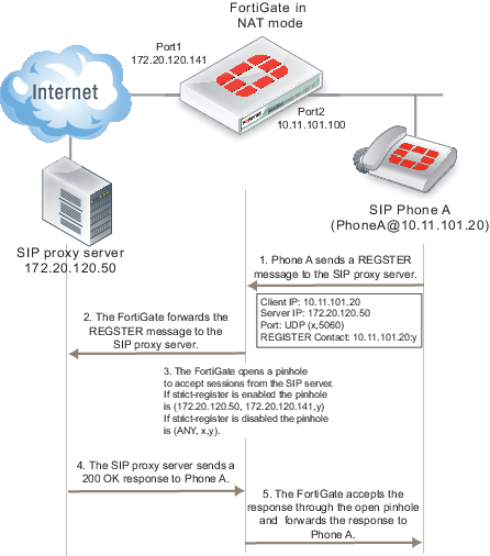 As soon as the server sends the 200 OK reply it can forward INVITE requests from other SIP phones to SIP Phone A. If the SIP proxy server uses the information in the REGISTER message received from SIP Phone A the INVITE messages sent to Phone A will only get through the FortiGate if a policy has been added to allow the server to send traffic from the private network to the Internet. Or the SIP ALG must open a pinhole to allow traffic from the server to the Internet. In most cases the FortiGate is protecting the SIP server so there is no reason not to add a security policy to allow the SIP server to send outbound traffic to the Internet.