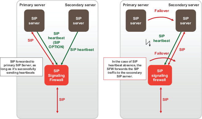 Maintains a active-standby SIP server configuration, which even supports geographical distribution. If the active SIP server fails (missing SIP heartbeat messages or SIP traffic) FortiOS will redirect the SIP traffic to a secondary SIP server. No special configuration is required for geographic redundancy, just standard HA configuration.