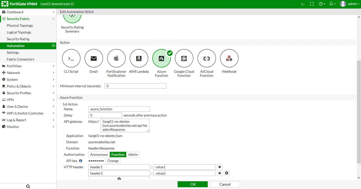 config system automation-action edit "azure_function" set action-type azure-function set azure-app "liang01-no-delete-jlum" set azure-function "headersResponse" set azure-function-authorization function set azure-api-key xxxxxx set headers "header1:value1" "header2:value2" next end - Create an automation trigger: