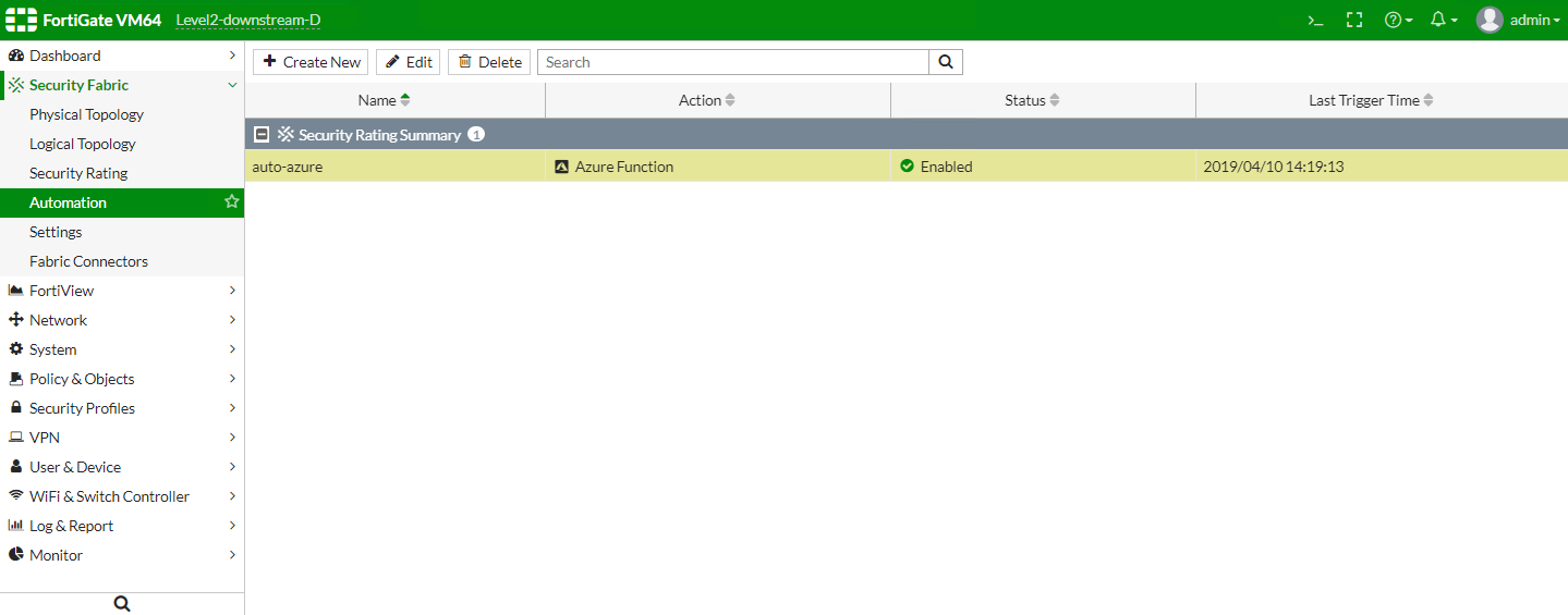 config system automation-trigger edit "auto-azure" set event-type security-rating-summary next end - Create the automation stitch: