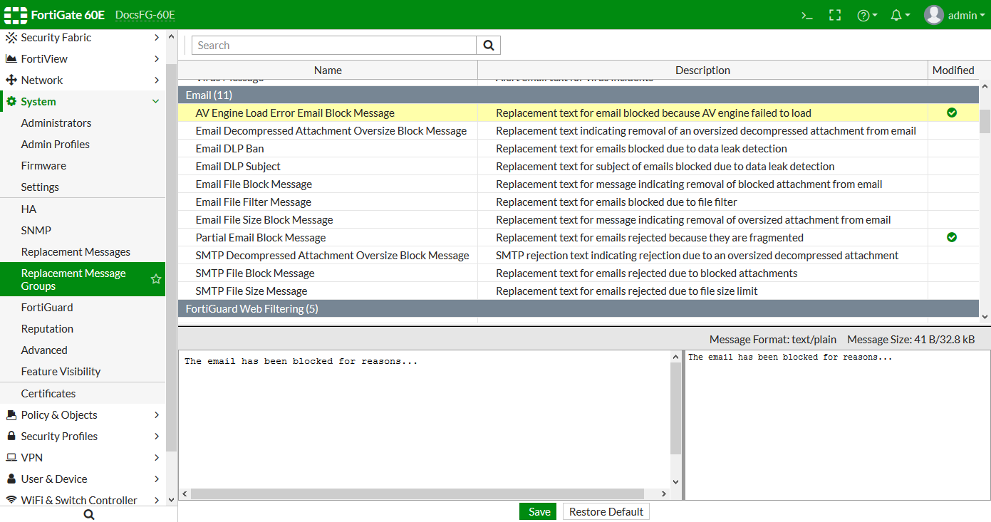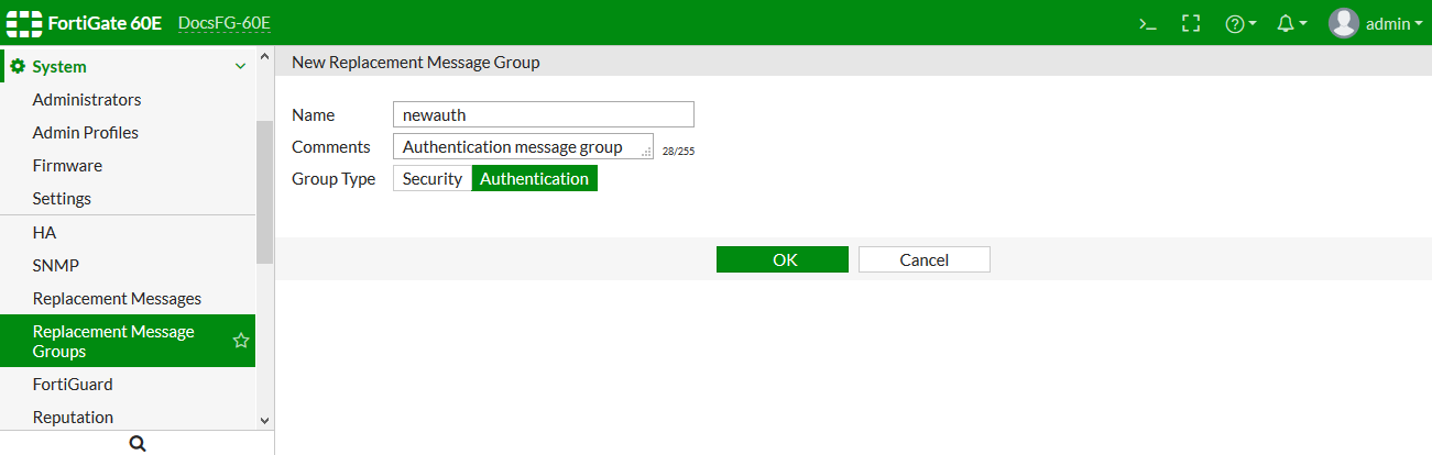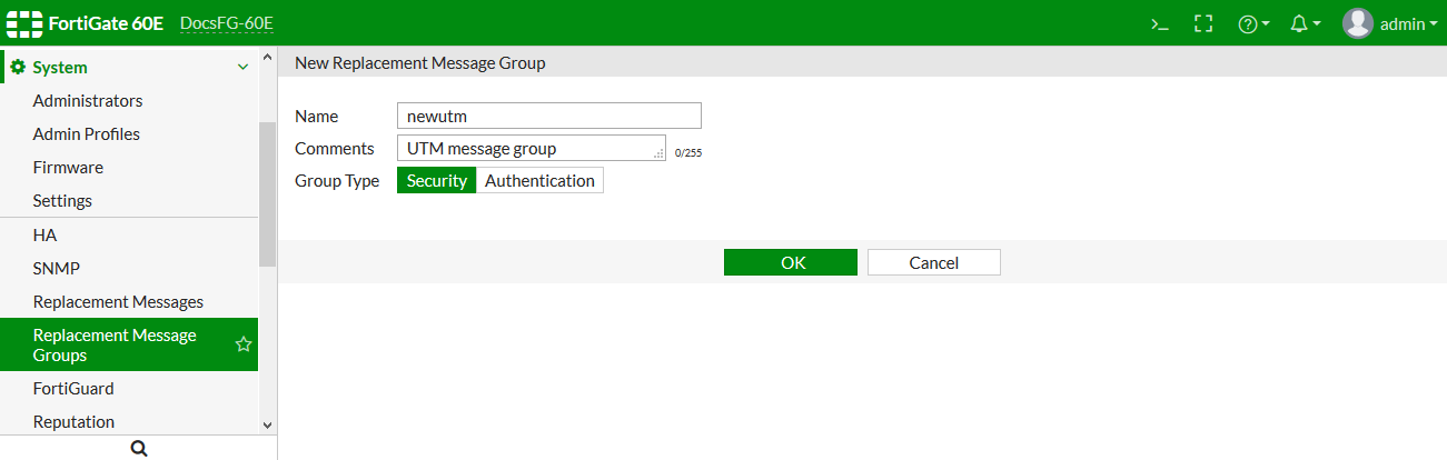 config system settings set gui-replacement-message-groups enable end - Go to System > Replacement Message Groups.