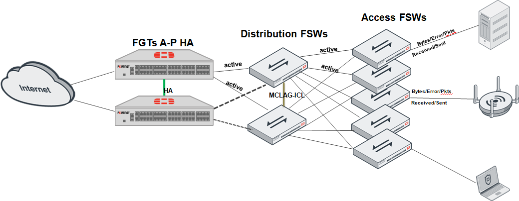 This example shows a FortiLink scenario where the FortiGate acts as the switch controller that collects the data statistics of managed FortiSwitch ports. This is counted by each FortiSwitch and concentrated in the controller.
