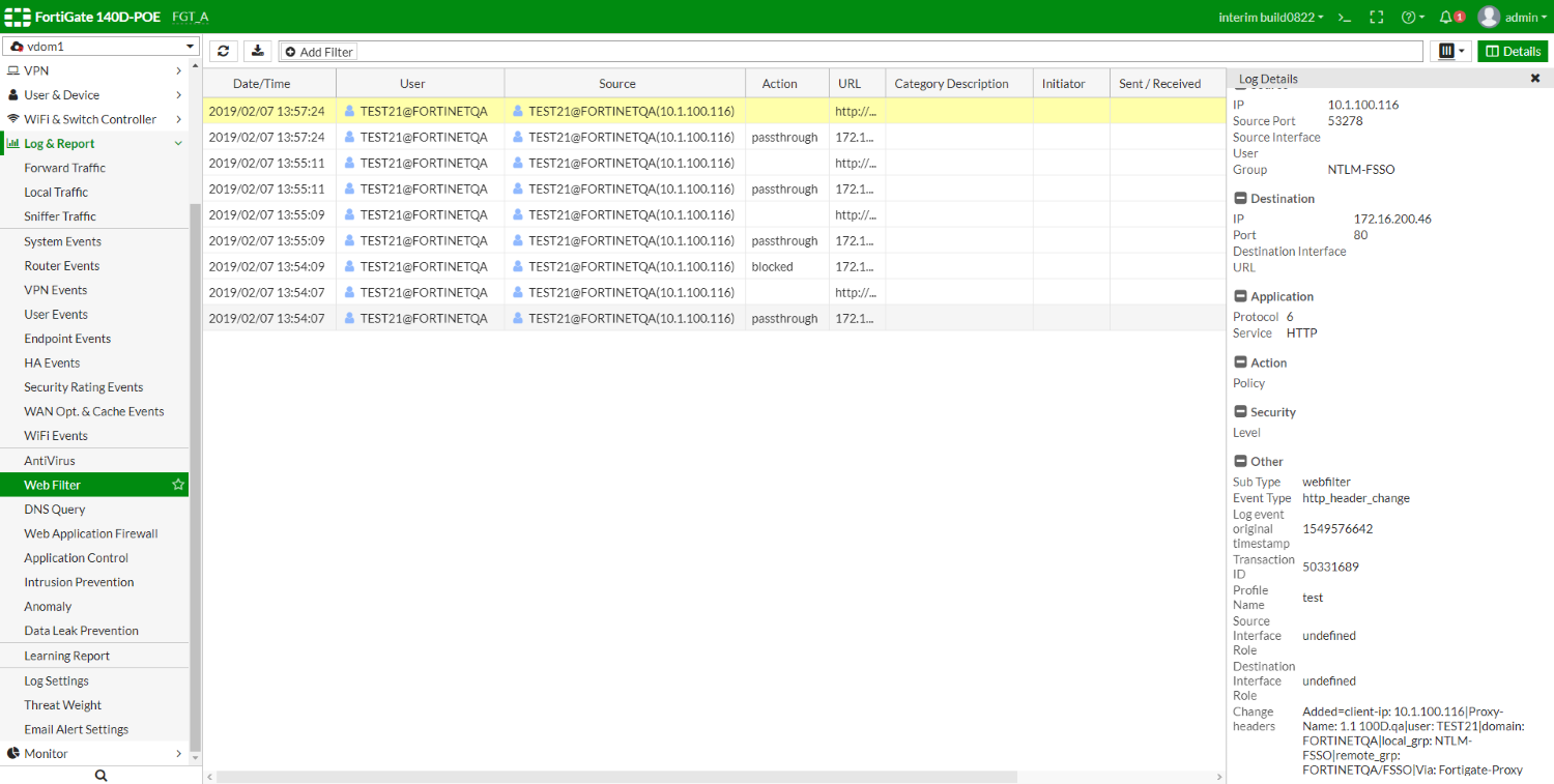 config firewall proxy-policy edit 1 set uuid bb7488ee-2a6b-51e9-45c6-1715bdc271d8 set proxy explicit-web set dstintf "port1" set srcaddr "all" set dstaddr "all" set service "web" set action accept set schedule "always" set logtraffic all set groups "NTLM-FSSO" set webproxy-profile "test" set utm-status enable set av-profile "av" set webfilter-profile "content" set ssl-ssh-profile "deep-custom" next end - Once traffic is being generated from the client, look at the web filter logs to verify that it is working.