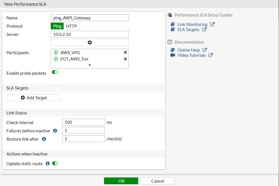 As you are accessing the servers on the 10.0.2.0/24 subnet, it is preferable to use the FortiGate port2 interface as the ping server for detection. This ensures that, if the gateway is not reachable in either tunnel, its routes are brought down and traffic continues on the other tunnel.