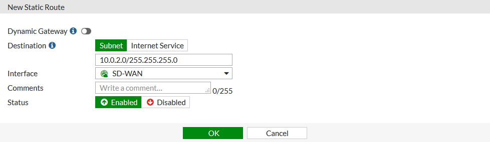 - Set Destination to Subnet and enter the IP address and netmask: 10.0.2.0/255.255.255.0.
