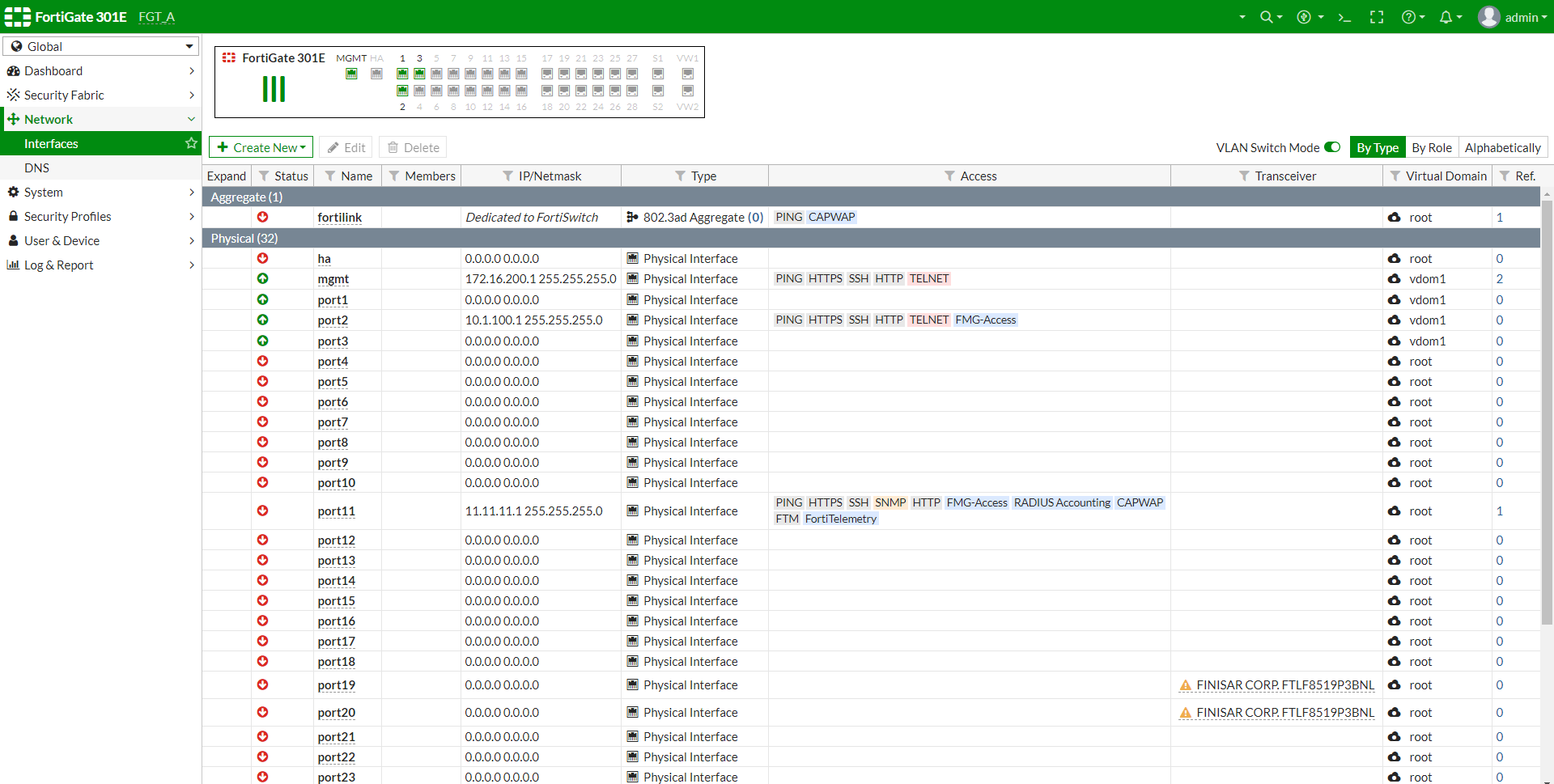 config system interface edit "VLAN switch" set vdom "vdom1" set ip 6.6.6.1 255.255.255.0 set allowaccess ping https ssh snmp http fgfm set type hard-switch set snmp-index 15 next end - (Optional) Create a trunk interface: