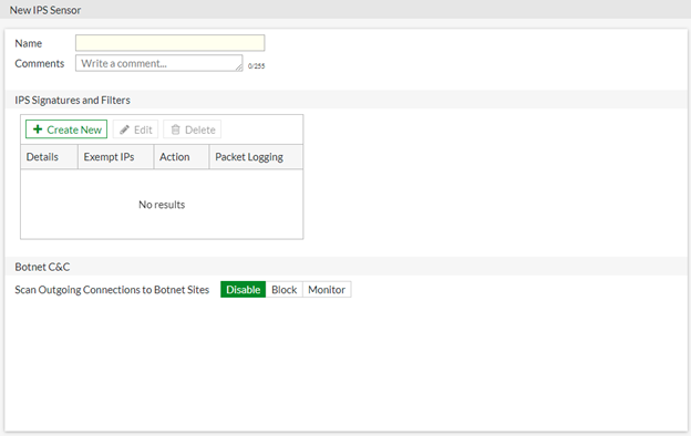 To view IPS sensors, go to Security Profiles > Intrusion Prevention. To create a new sensor, click Create New.