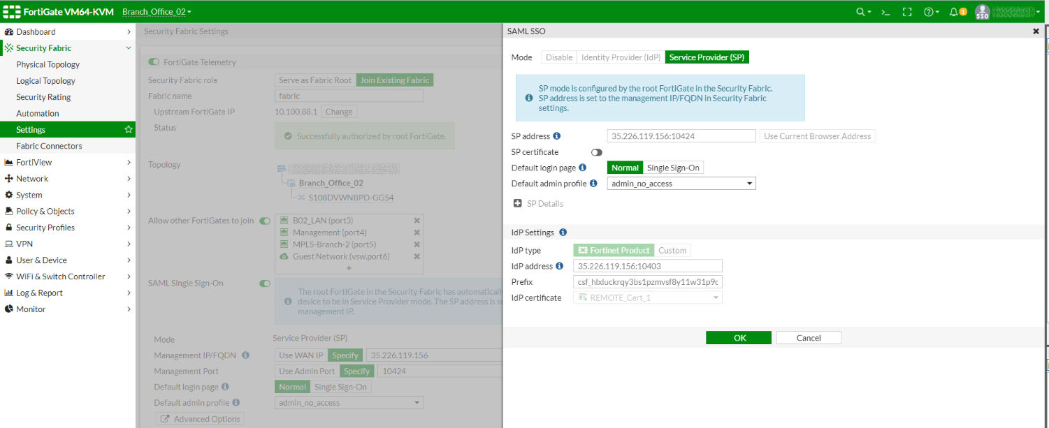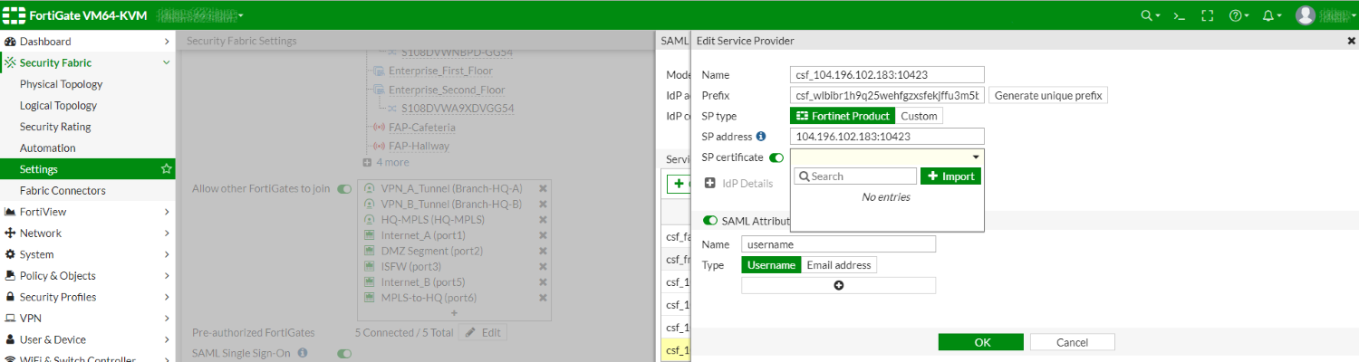 Because communication between the root FortiGate IdP and FortiGate SPs is secured, you must select a local server certificate in the IdP certificate option on the root FortiGate. When downstream SPs join the IdP (root FortiGate), the SP automatically obtains the certificate.