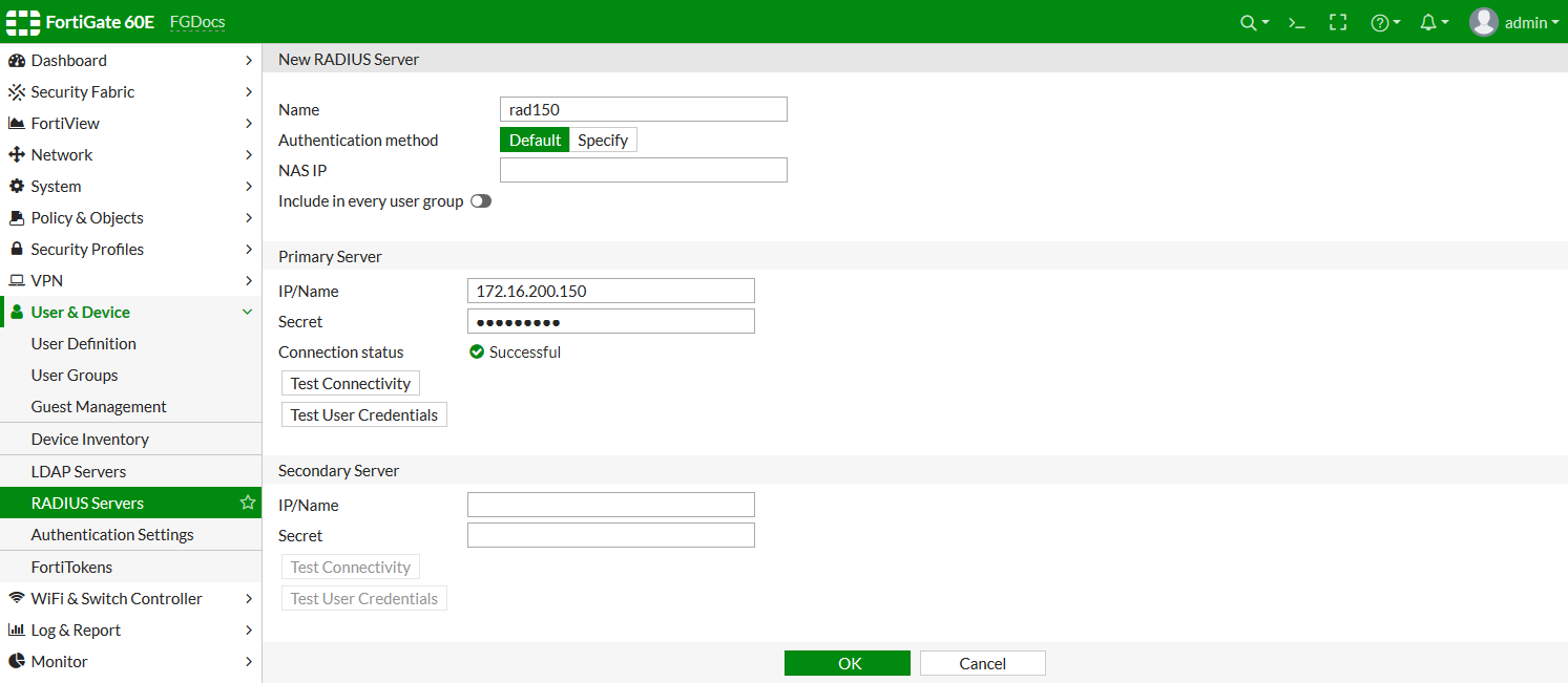config user fsso edit "AD_CollectAgent" set server "172.16.200.60" set password 123456 next end - Add the RADIUS server: