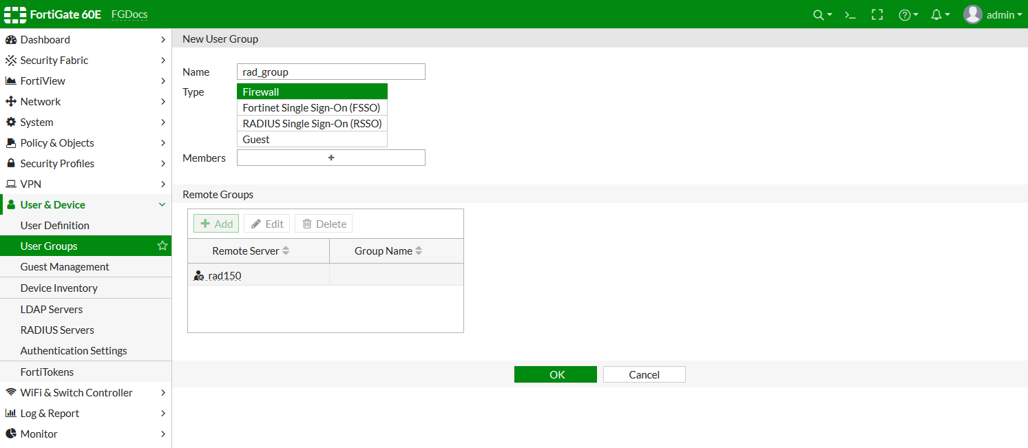 config user radius edit "rad150" set server "172.16.200.150" set secret 123456 set acct-interim-interval 600 config accounting-server edit 1 set status enable set server "172.16.200.60" set secret 123456 next end next end - Create a user group for the RADIUS server: